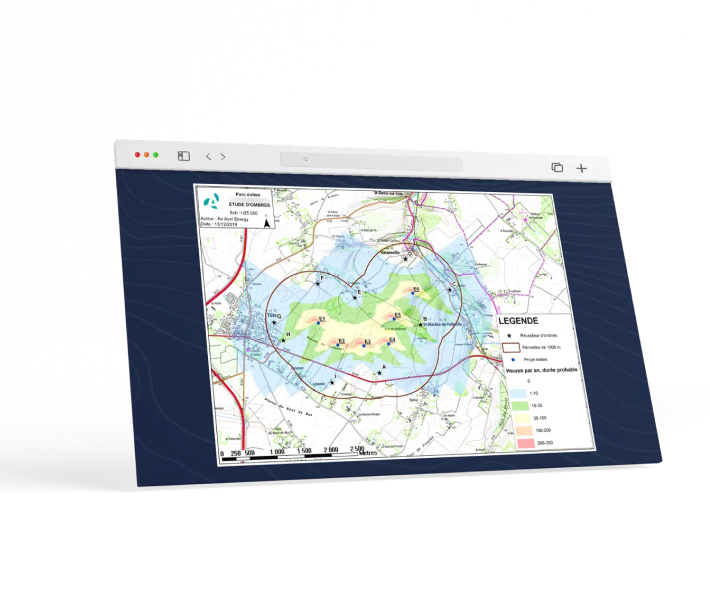 Evaluation des effets des projections d'ombres sur les habitations et locaux présents à proximité du parc éolien. L’étude d’encerclement permet d’évaluer les risques de saturation visuelle. An Avel Energy réalise l’analyse théorique (cartes et indices d’occupation et de respiration) et réelle (photomontages à 360°).