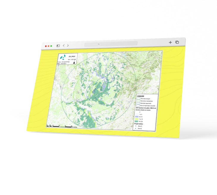 Identification du nombre d’éoliennes visibles depuis tous les points géographiques du territoire étudié. ZVI réalisées avec le logiciel Windpro, mise en page à l’aide d’un logiciel SIG. Prise en compte des obstacles et de la végétation. Calcul des effets cumulés, entre plusieurs projet éoliens ou avec un ou plusieurs parcs existants.